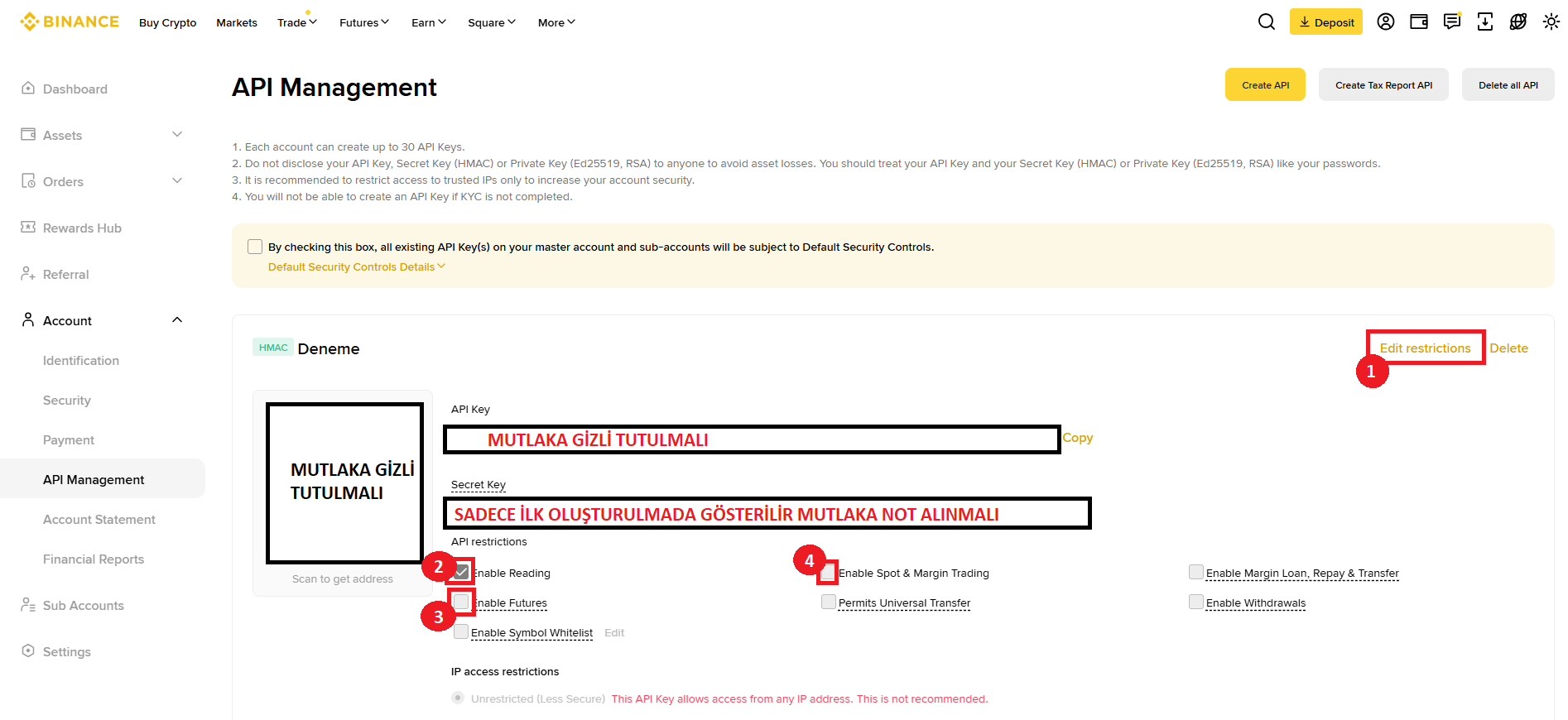 Web Sitesi Üzerinden Binance API Key Oluşturma